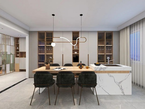 進(jìn)入餐廳,映入眼簾的就是整面墻的酒柜,玻璃柜門與金屬線條的裝飾,滿滿的輕奢質(zhì)感。