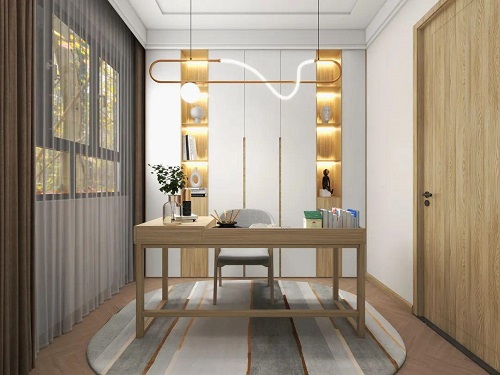原木系的書柜書桌,搭配一些金屬五金的裝飾,也能帶有輕奢質(zhì)感,在新穎的吊燈搭配下,原木書房也能有高級(jí)的時(shí)尚感。
